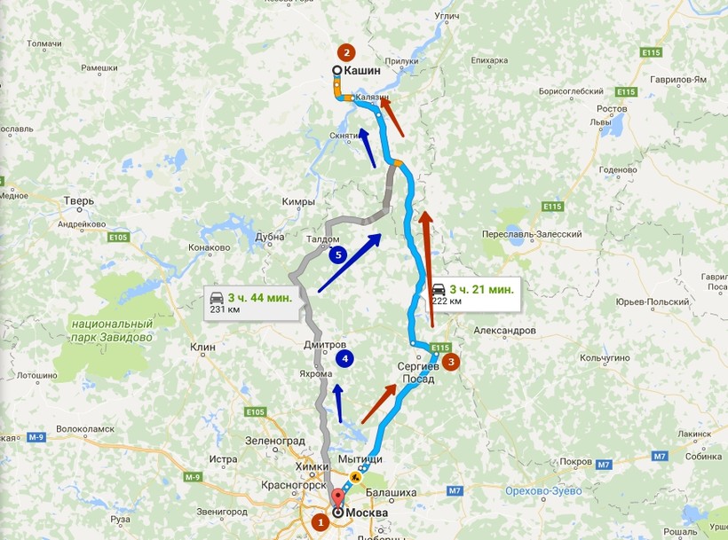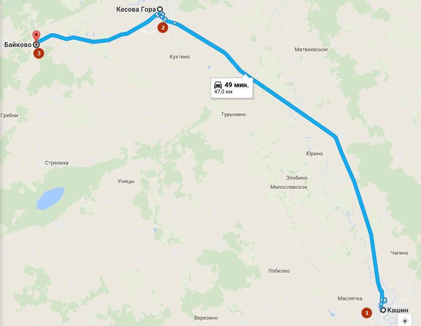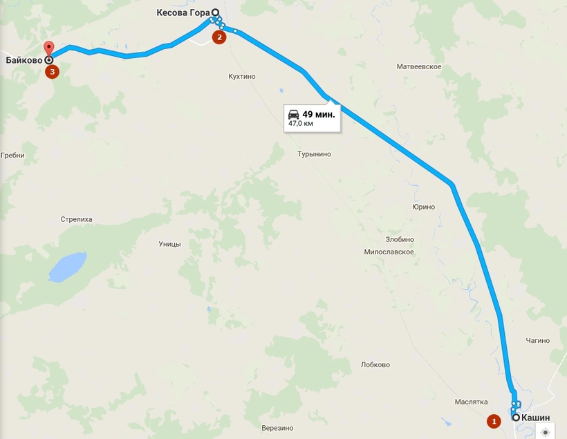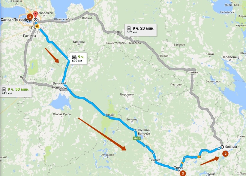 Выезжаем в Кашин (2) из Северной столицы (1) на М10/Е105 и следуем до Твери (3).