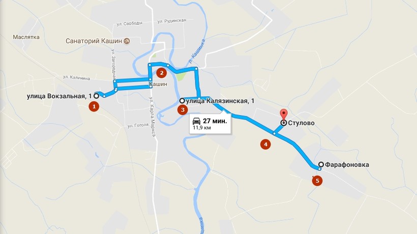 Пролегает он мимо центра города (2) – Автотранспортного предприятия (3), находящегося на Калязинской ул., 1 – сельского поселения Кашинского района Стулово (4) – до деревеньки Фарафоновка (5). Специально выше дала карту, чтобы вы убедились, что Кашин – городок маленький, который весьма проходим пешком (весь несколько раз за день). Автобус уходит от автовокзала в: 7:30; 8:30; 9:30; 11:30; 12:30; 15:30; 16:30 и 17:30.