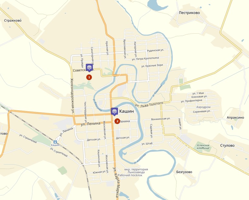 Переезжаем его и снова двигаемся прямо, минуем переезд и въезжаем в Кашин на ул. Карла Маркса (230 км от МКАД).