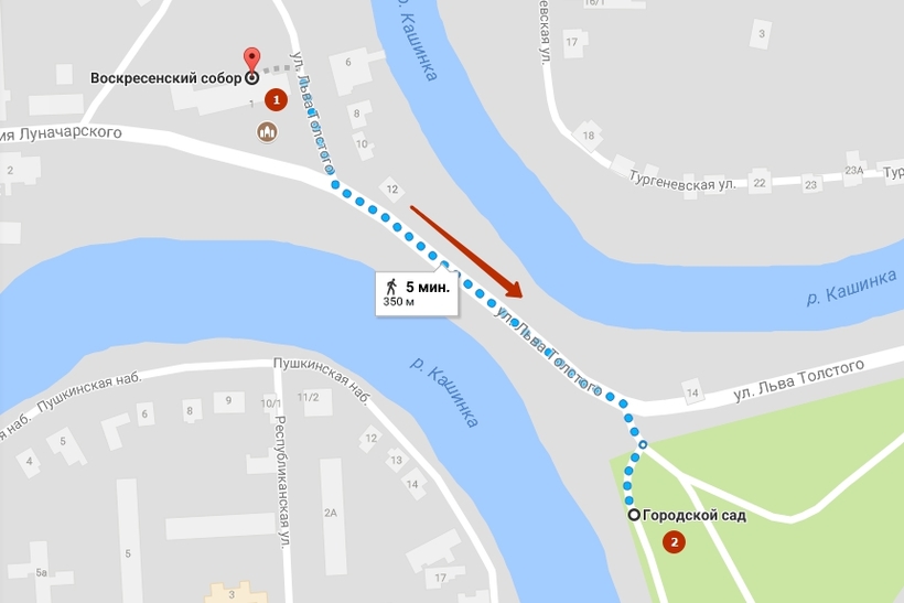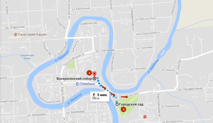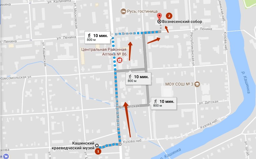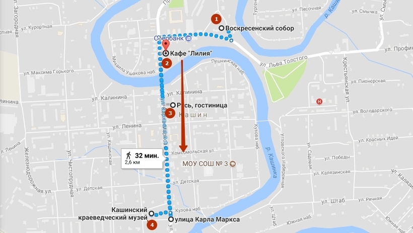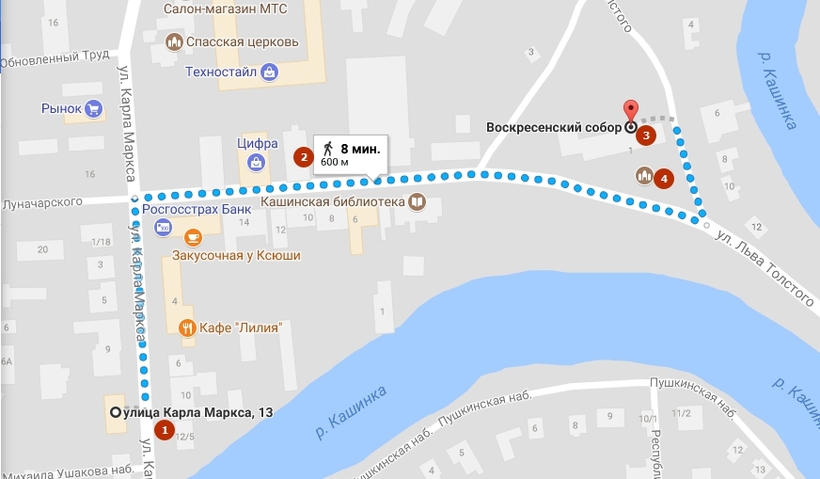 10.00 — Пройдем от столовой (1)до ул. Луначарского.Здесь обозрим знаменитые кашинские торговые ряды (2) и направимся к сердцу города Воскресенскому собору (3).Возможно, попадем на службу, а если нет, то просто побудем в этом замечательном соборе.Непременно поднимемся на колокольню (вход — 100 рублей), сделаем снимки города для личного Instagram, повествующему миру о наших приключениях. Рядом с собором полюбуемся на памятник Святой княгине Анне Кашинской (4).