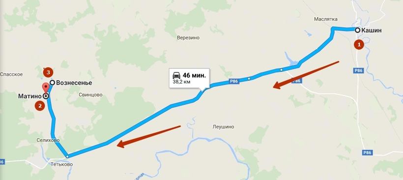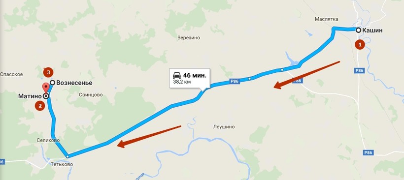 По Дмитровскому шоссе через Дмитров (4), Талдом (5), село Спас-Угол (тут родился М.Е. Салтыков-Щедрин) стремимся к Калязину.