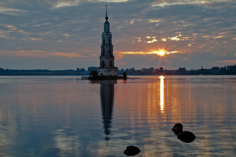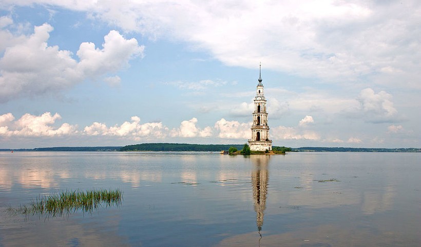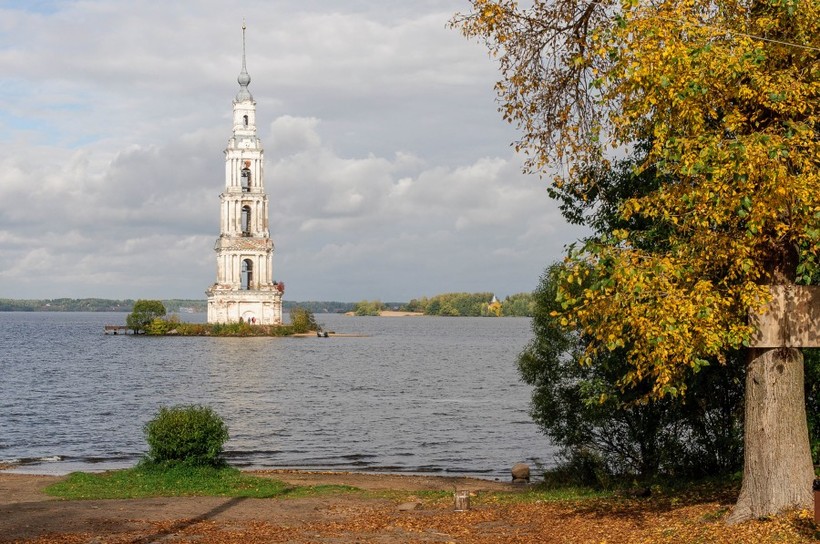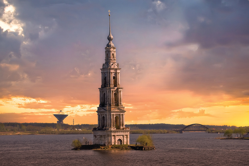 Это — колокольня Никольского собора (30 км от Кашина), ныне затопленного при создании Углического водохранилища. Сегодня она является памятником истории и архитектуры. Грустным памятником, прямо скажу. Воздвигнута эта удивительная звонница ещё в 1800 году при Никольском соборе (1694 г.), который находился на территории Николо-Жабенского монастыря. Колокольня имела 5 ярусов и поднималась на высоту 74,5 м. Когда-то округу оглашал перезвон её 12 колоколов, самый крупный из которых весил 1038 пудов (пуд — 16 кг) и был отлит в 1895 году на монастырские средства в честь коронации Николая II. О том, как проходило затопление части Калязина и о реализации проекта Волгостроя, в результате которого были потеряны и другие города (например, Молога) хорошо написано в воспоминаниях архимандрита Павла Груздева. Когда-то в этих местах были прекрасные заливные луга. Созданное искусственное море нарушило экологический баланс. А о том, как его появление отразилось на жизни людей, вынужденных в те годы покинуть свой кров, также можно узнать из литературы. Кстати, особой пользы от всех вмешательств «царя природы» в её порядки не произошло, скорее — наоборот. Поначалу колокольня, оказавшаяся посреди воды, служила своеобразным маяком для судов. В конце 80-х годов XX века её фундамент укрепили, а вокруг создали искусственный островок. Символично то, что в мае 2007 года в колокольне была отслужена первая божественная литургия. Недавно, в 2016 году на звоннице установили 5 колоколов, и мы с вами сегодня можем увидеть это чудо — поднимающуюся из воды колокольню, наконец, вновь обретшую голос..