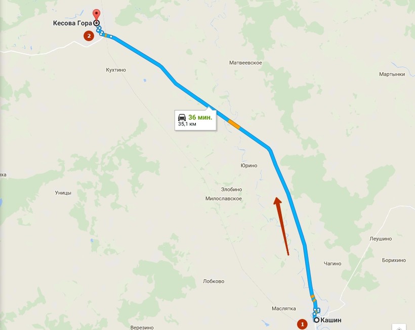 Проезжаем по городу. В Твери, двигаясь по Петербургскому шоссе и следующим за ним улицам, вам нужно после моста через р. Тверцу повернуть левее на улицу Шишкова, переходящую в Бежецкое шоссе. Потом направляемся к с. Кушалино, где на перекрестке сворачиваем направо и едем до с. Горицы. В Горицах на первом перекрестке налево. И снова едем прямиком до Кашина, въезжая в него по Калининскому шоссе (679 км от Санкт-Петербурга).