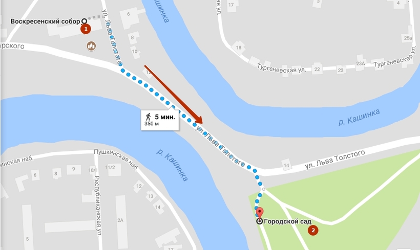 11.30 — Прогуляемся по улице Льва Толстого по самой узкой перемычке кашинского сердечка, образованного речкой Кашинкой, любуясь ею и справа и слева от себя.Немного побродим по городскому саду.