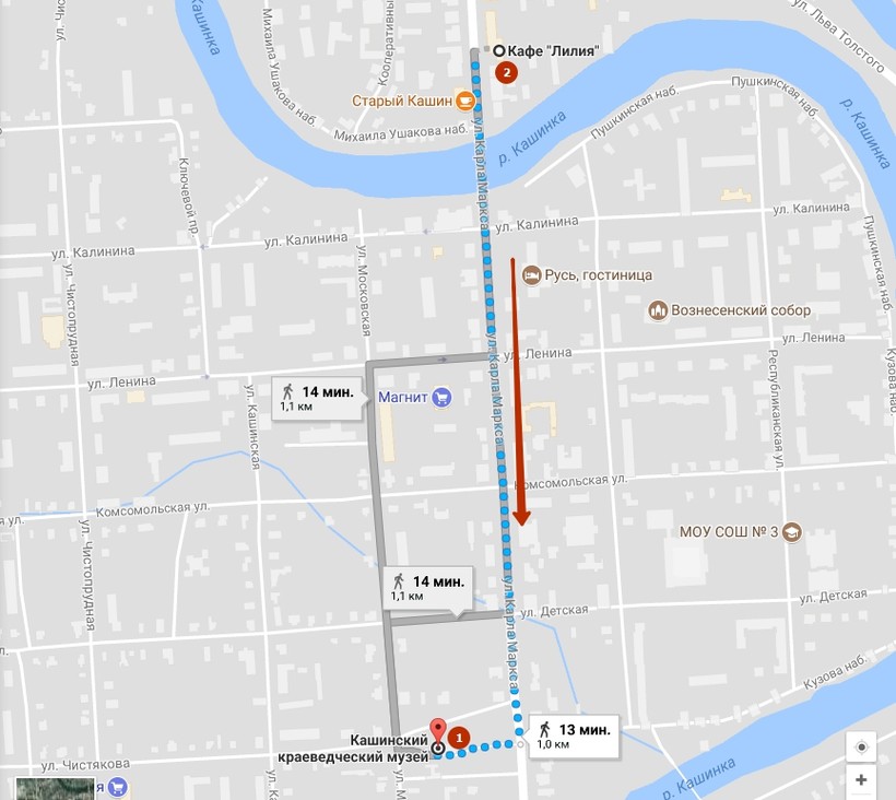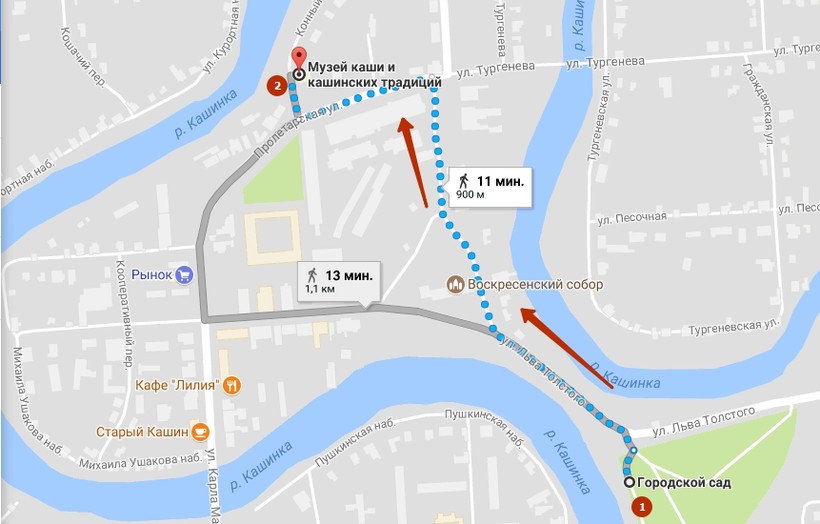 15.30 — Теперь продолжим ознакомление с городком в Кашинском краеведческом музее (1).От кафе (2) доберемся также весьма быстро.Музей работает до 17.00, и у нас достаточно времени на экскурсию и посещение сувенирной лавки, расположенной в нем.