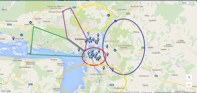 В городе Казань районы разделяют на: Авиастроительный (желтый), Кировский (зеленый), Московский (фиолетовый), Ново-Савиновский (голубой), Вахитовский (красный), Советский (синий) и Приволжский (оранжевый). Центральным считается Вахитовский административный район. Здесь же расположено наибольшее количество вариантов размещения, и лишь немного в этом плане Вахитовскому уступает Ново-Савиновский район. Почетное третье место по количеству гостиниц занимает Советский район.
