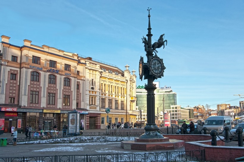 Площадь ограничивают два здания - ГУМ и бывшие "Коммерческие номера" (реконструированное здание начала 20 века), здесь находятся офисы, магазины и большое количество разных кафе.