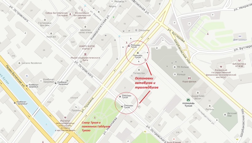 Вам нужна остановка «Площадь Тукая». Их две – одна прямо у площади на ул.Пушкина, а вторая на ул.Островского около сквера Тукая (вторую чаще называют "Сквер Тукая", однозначного названия для всех маршрутов нет). И там, и там проходит большое количество автобусных и троллейбусных маршрутов.