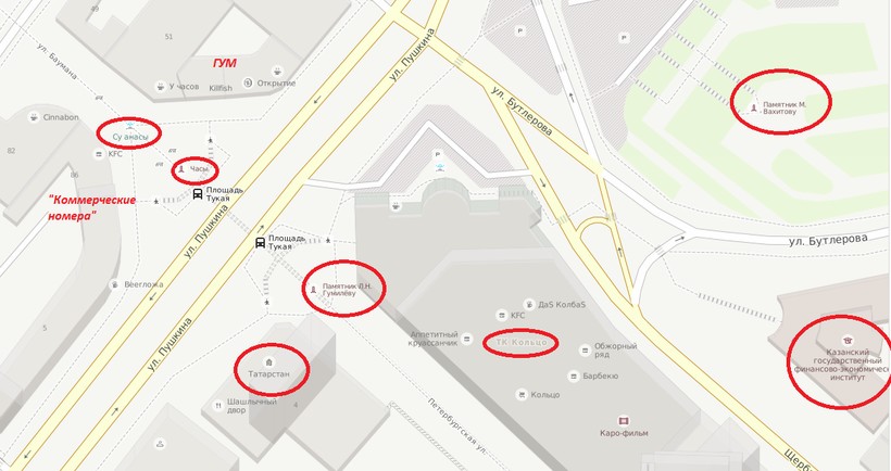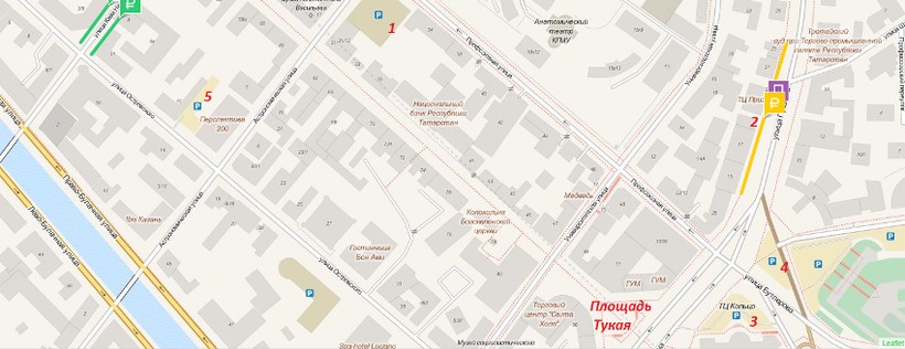 Около площади Тукая на улице Пушкина есть участок с разрешенной парковкой (на рисунке это №2) - стоимость парковки 50 руб./час. В ТЦ "Кольцо" (№3) имеется и наземная и подземная парковки - первый час бесплатно, затем оплата в зависимости от времени. Остальные отмеченные парковки платные, стоимость от 50 руб./час, но зависит от времени. №1 и 5 - платные многоуровневые парковки.