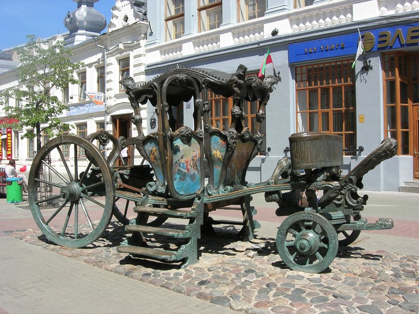 Рядом с театром еще одно место must see на Баумана и вообще в Казани – это памятник карете Екатерины Великой. Именно на ней императрица посетила наш город в 1767 году. Тот визит в Татарстане запомнили, потому что правительница дала добро на строительство каменных мечетей (до этого были лишь деревянные).