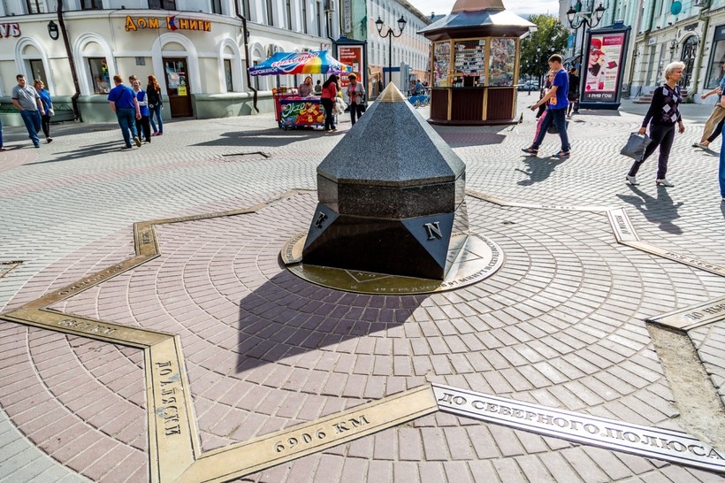 Действительно, можно начать отсчет от Казани – от нулевого меридиана, самого центра города. Там все и указано: до Москвы 722 км, до Нью-Йорка придется преодолеть 8033 и так далее. На меридиане – памятном знаке, установленном в 1999, – любят лежать, его обнимают, возле него регулярно позируют.