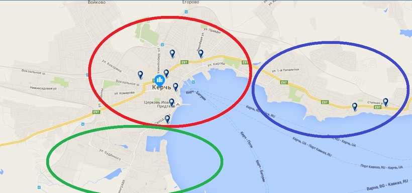 Поскольку административное деление городов Крыма в свете нынешней политической ситуации и не до конца завершившейся интеграции полуострова в российскую реальность остается достаточно условным, мы вновь позволим себе самоуправство и самостоятельно разделим Керчь (а вернее сказать – ту часть города, где сосредоточено большинство гостиниц и отелей) на три условные части: центральную (красный), восточную (синий), и южную (зеленый).