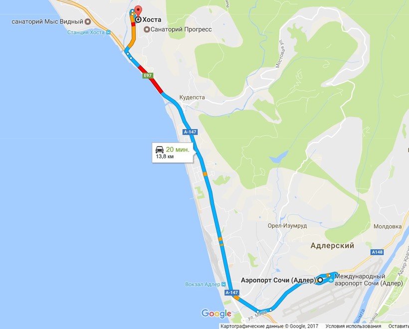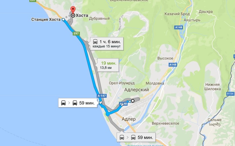 В целом добраться до Хосты от аэропорта можно довольно быстро: на автомобиле (такси) вы будете ехать всего около 20 минут, на автобусе поездка займет полчаса –час в зависимости от количества остановок, на электричке — ровно час. В любом случае само путешествие до Хосты уже доставляет удовольствие — дорога идет почти все время вдоль моря или среди живописных видов горного серпантина.