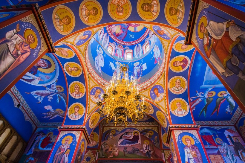 Стены храма расписаны в византийском стиле, потолок украшен изящным рисунком, имитирующим мраморную плитку — отголоски итальянского стиля, боковой ход из резного дуба напоминает интерьер Софийского Собора в Великом Новгороде. По праздникам в стенах храма собирается около 500 прихожан.