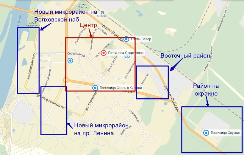 Границы Центрального района я отметила на карте красным цветом. Как видно, в этом районе расположено большинство гостиниц Киришей.