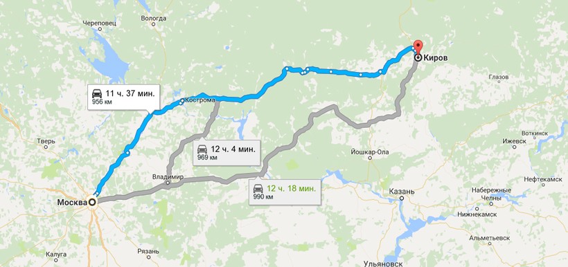 Из столицы в Киров можно добраться через Кострому или через Нижний Новгород. Большинство автолюбителей предпочитает второй вариант из-за более хорошего качества трассы. В пути придется провести около 12–14 часов, разнообразить дорогу я советую небольшой приятной остановкой в Ярославле или Владимире.