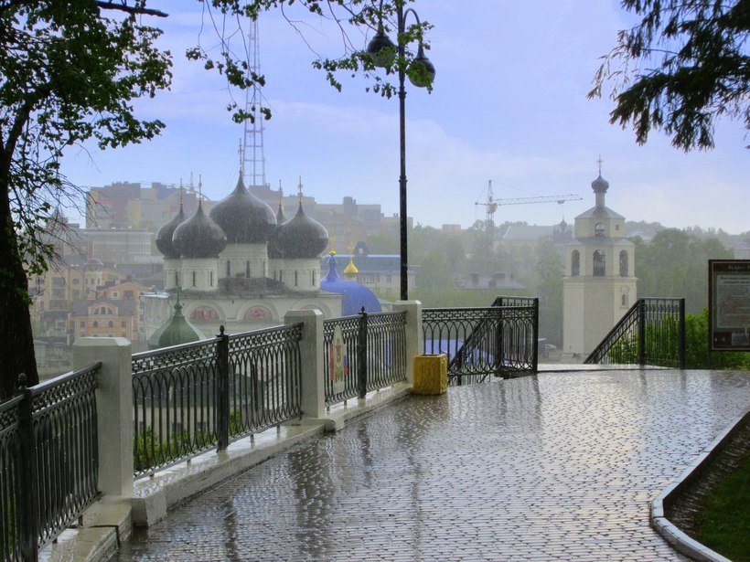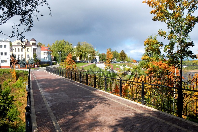 - Где-то в 11:30 вы окажитесь в самом конце набережной, на смотровой площадке около Вечного огня. Предлагаю спуститься вниз по лестнице и идти вверх по улице вдоль ансамбля Трифонова монастыря.