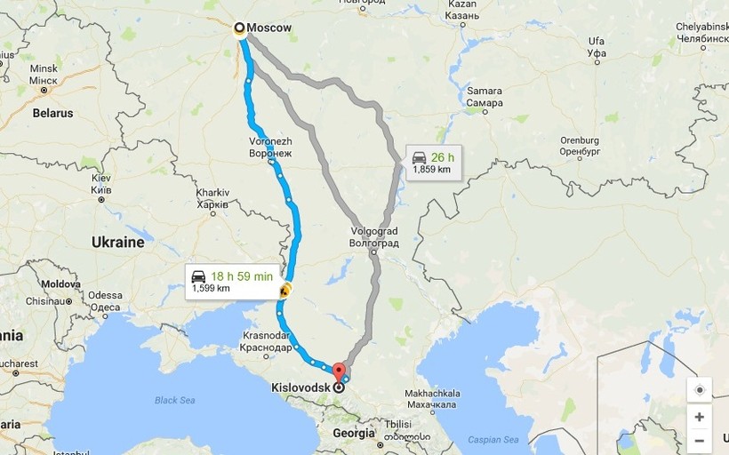 На карте показано несколько вариантов маршрута до Кисловодска из Москвы. Самый короткий выделен голубым цветом. Это 1599 километров и около 20 часов на дорогу. По моим скромным подсчётам расходы на бензин составят 3 500 рублей. И я бы не рекомендовала проделывать этот маршрут без остановки, поэтому к расходам на транспорт стоит добавить траты на проживание где-нибудь под Воронежом или в Ростовской области.