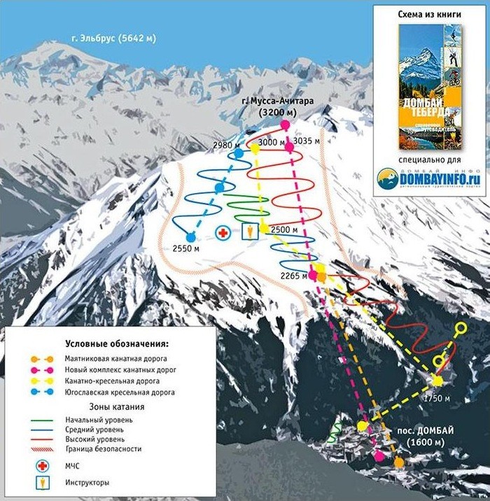 Большая часть лыжных склонов ведёт к снежной поляне под Муссой. Здесь есть много кафе и закусочных, где можно перекусить или согреться горячим чаем. Также на Домбае работает горнолыжная школа, опытные инструкторы помогут встать на лыжи впервые или улучшить навык.