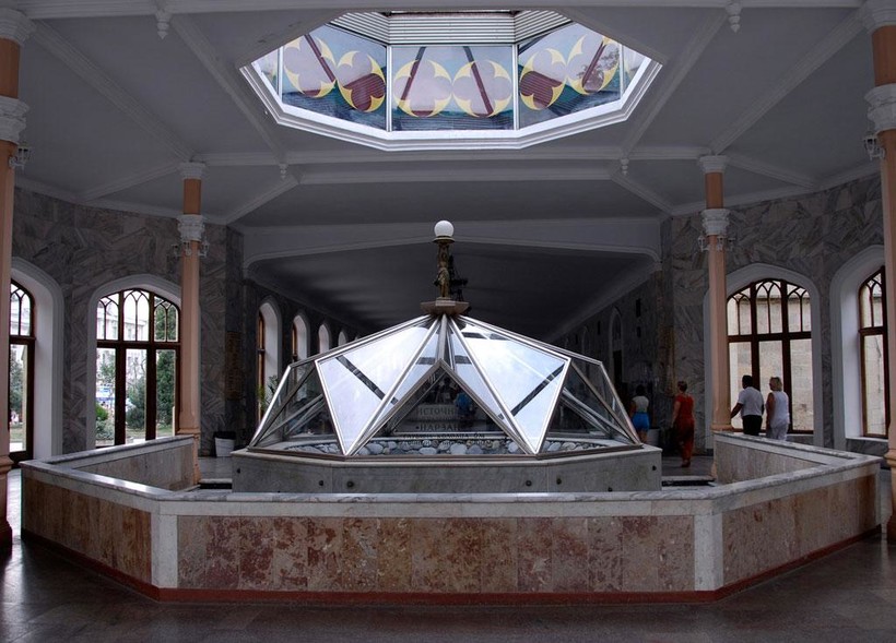 - Затем пройдите к Нарзанной галереи – длинному зданию с фонтаном во дворике. Самая неспешная прогулка едва займёт час. В галерею зайти стоит обязательно. Внутри под стеклянным куполом находится нарзанный "кипящий" колодец, а по всей длине галереи установлены питьевые бюветы – тумбы с кранами. Вход в галерею и вода в ней, разумеется, бесплатны. Нарзан здесь представлен тремя видами: общий, сульфатный и доломитный нарзаны. Каждый из них, в свою очередь, есть в двух вариантах – холодном и подогретом. Курортники воду пьют по медицинским показаниям, но в малых дозах её можно испробовать всем. Дегустировать предполагается на месте, поскольку вода, набранная с собой, уже не так хороша, как свежая из-под крана. У сульфатной специфический привкус, поэтому я рекомендую попробовать её именно в холодном виде.