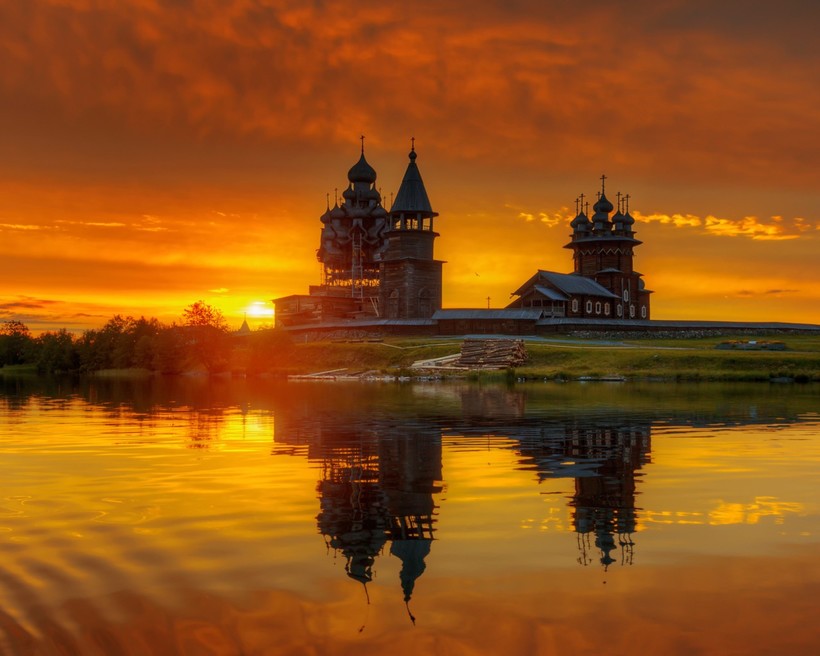 Для меня Кижи всегда был изумрудным островом, который раскинулся в северной части Онежского озера. Почему изумрудным? Потому что кругом расстилаются зелёные просторы, изредка украшенные деревцем, и даже берега озера покрыты зелёным и золотистым тростником и водорослями. На фоне этой зелени встают тёмной громадой церковь Преображения Господня, Восьмикрылая мельница и церковь Покрова Богородицы. При этом они так удачно вписываются в окружающий пейзаж, что остаётся только удивляться прозорливости древних зодчих.