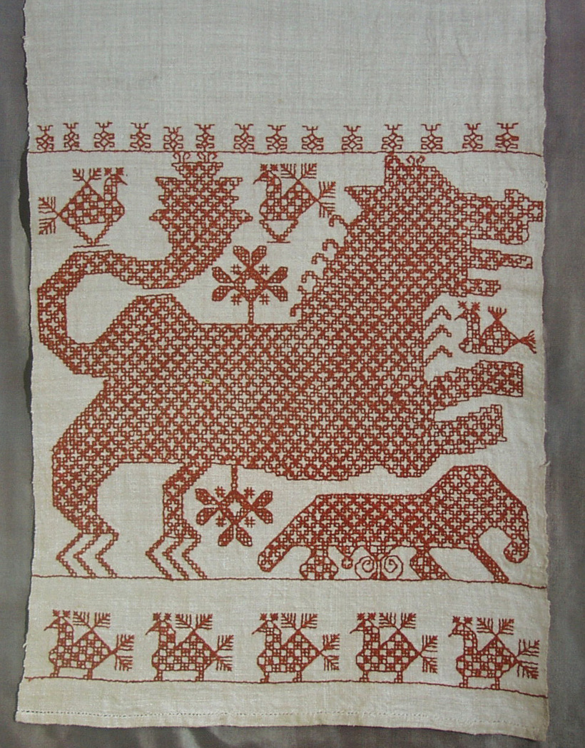 - Прихватки, фартуки, полотенца с заонежской вышивкой. Красные, геометрические узоры, типичные для этого региона на белоснежном или сером фоне (зависит от ткани) являются предметами стараний оставшихся карельских мастериц. Стартовая цена — 200 руб. и до 2 000 руб.