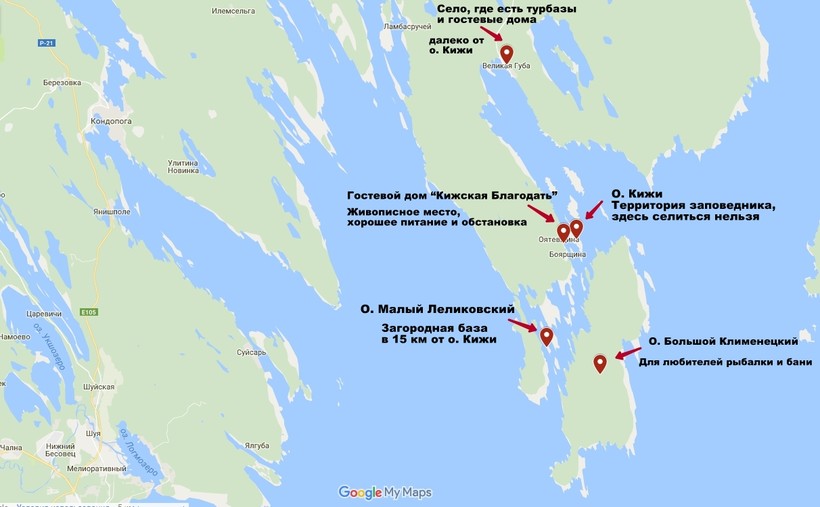 Острова не слишком отличаются друг от друга. Тут везде карельская природа или так называемая «глубинка». Если рассматривать их с точки зрения отдаленности от острова Кижи, то ближе всех к нему расположен остров Большой Клименецкий. Что касается цен, то тут тоже небольшой разброс. При наличии скромного бюджета ты можешь расположиться в палатке на любом из островов.