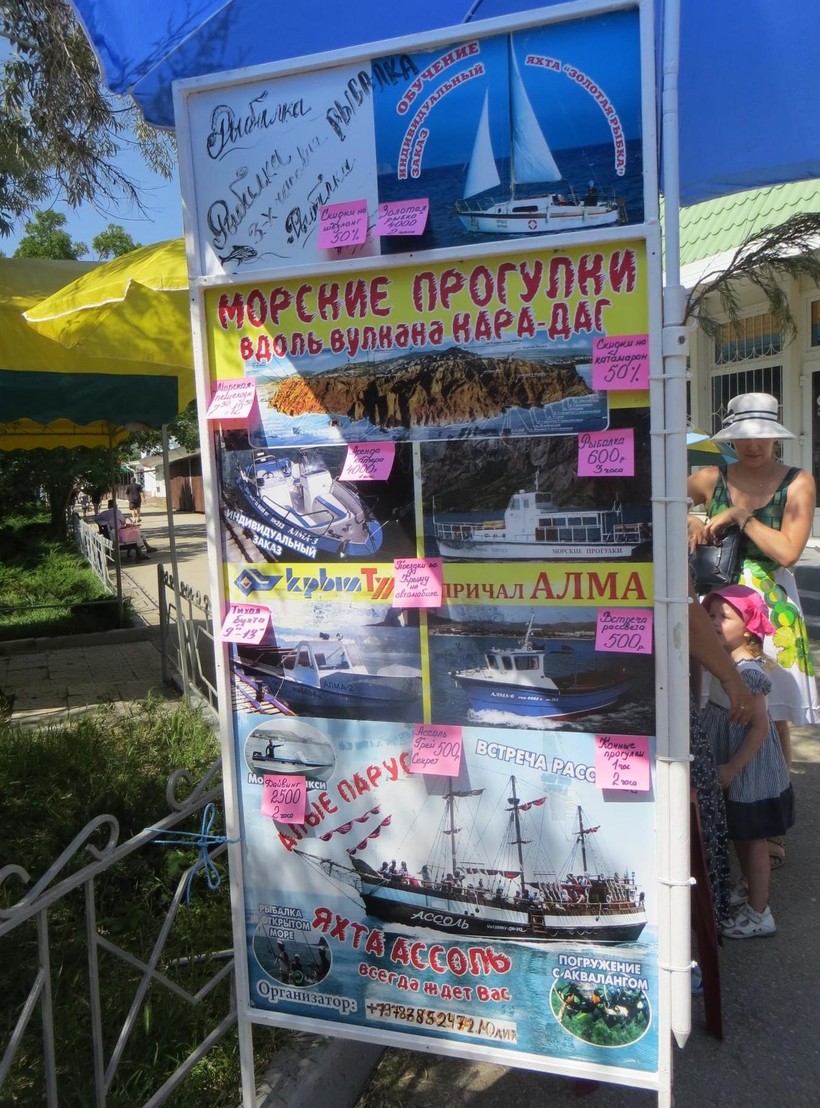 В дневное время на набережной работают зазывалы, которые предлагают экскурсии-путешествия по Крыму. У них вы можете приобрести билеты на прогулки с осмотром достопримечательностей полуострова.