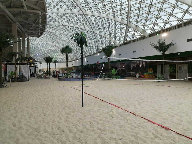 Есть бассейны, один из которых волновой — имитирует океанические волны. Покрытие в аквапарке в Красной Поляне — песчаное (песок подогревают зимой, ходить по нему очень комфортно). На начало июня 2021 г. горки в комплексе временно не работают.