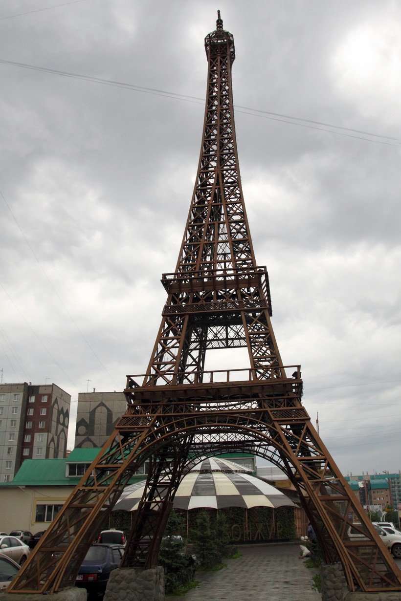 Имеется и своя Эйфелева башня в городе Красноярске. Ее возвели в 2007 году. Это во много раз уменьшенная точная копия, оригинальной башни в Париже. Высота этой башни 14 м 8 см. Ночью она подсвечивается, и становиться объектом восхищения, как туристов, так и местных жителей.