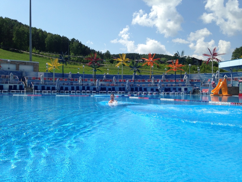Это зона с бассейном, терраса для шезлонгов, место, где можно хлюпаться в бассейне и понежиться на теплом солнышке. Имеются горки. Стоимость пребывания составляет всего 800 рублей за день, в выходные дни стоимость для взрослого поднимается до 850 рублей, для детей составляет 540 рублей, дети до семи лет проходят на территорию бесплатно.