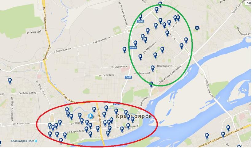 Зеленым цветом обозначен Советский район. Советский район находиться по левой стороне реки Енисей. На районе имеется автомобильный и железнодорожный мост. Район постоянно строиться и расширяется. Здесь такие заведения, как: стоматологические клиники, пожарные точки, медицинские центры. Пожалуй, один из самых развитых районов Красноярска. В районе имеются гостинцы, но он меньше располагает к туристическим прогулкам и отдыху, в связи с постоянными стройками