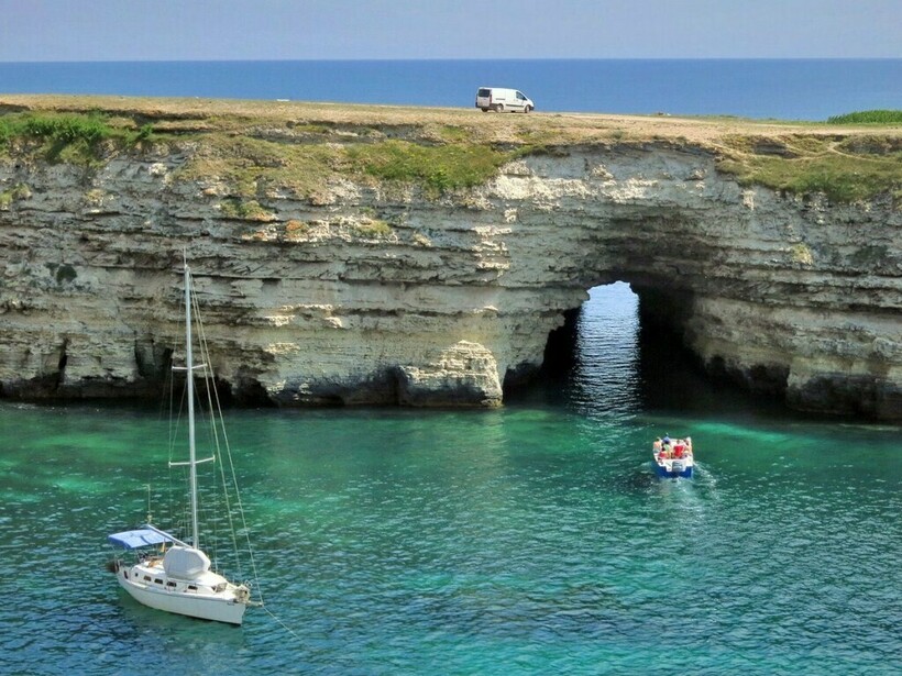 Мыс Тарханкут — полуостров и природная достопримечательность Крыма. Немноголюдные песчаные пляжи возле поселков Оленевка и Маяк известны своей кристально чистой водой. Подводный рельеф с гротами, валунами и затонувшими судами очень популярен у российских дайверов, которые погружаются здесь на глубину до 40 метров. На полуостров лучше всего ехать на собственном автомобиле. Если вы хотите узнать, как добраться на машине до мыса Тарханкут в Крыму, будьте готовы к некоторым сложностям: участкам грунтовой дороги, редким заправкам, отсутствию автосервисов.