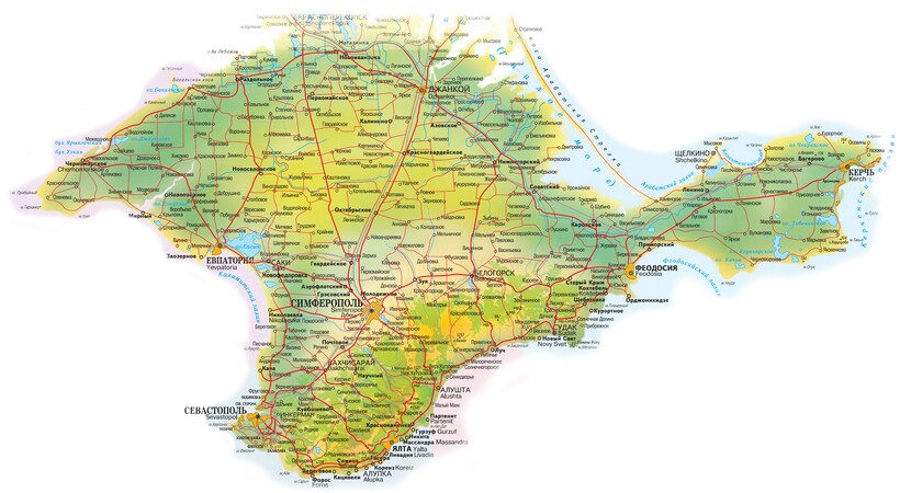 - большими прописными буквами — все крымские города (Керчь, Евпатория, Феодосия, Джанкой, Симферополь, Ялта, Севастополь и другие);