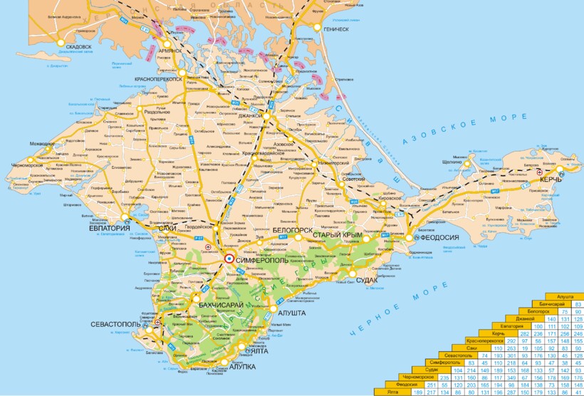 Крымский полуостров на карте дорог пронизан оранжевыми и белыми полосами: первые — это главные автомагистрали, вторые — менее значимые шоссе (соответственно, их состояние будет хуже). В нижнем правом углу карты-схемы в таблице отмечено расстояние между крупнейшими городами Крыма (если преодолевать путь по автомагистралям).