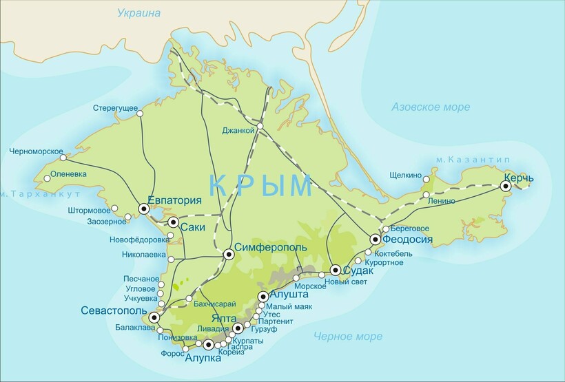 Как показывает эта карта Крыма с городами, побережье Черного моря выигрывает по количеству курортов. На Азовском море мест для пляжного отдыха не так много.