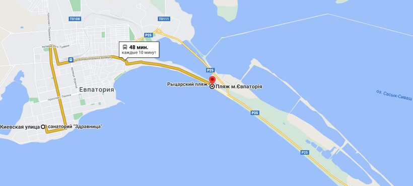 Из Симферополя дорога в 60 км до Сасыка на машине занимает 1,5 часа, 106 км из Севастополя можно преодолеть за 2 ч.