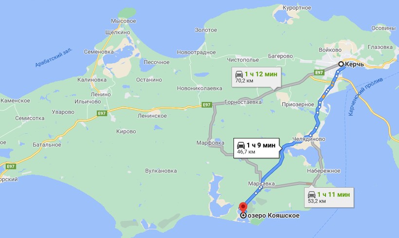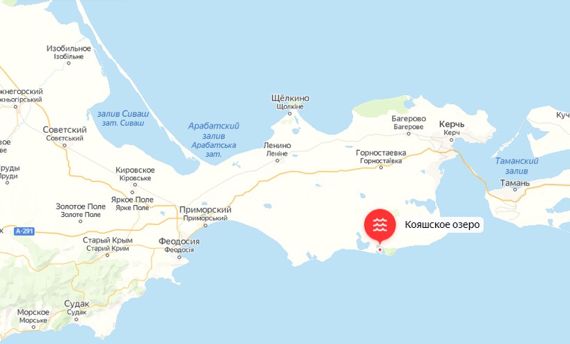 Лучше всего ехать на Кояшское озеро Крыма на автомобиле: от Керчи следуйте 37 км по шоссе Героев Эльтигена до Марьевки, от села продолжайте путь по грунтовой дороге на юго-запад. От Феодосии двигайтесь 70 км по трассе М17, не доезжая до Горностаевки сверните направо на Марфовку, и следуйте на юг еще 40 км.