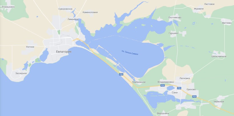 Озеро Сасык-Сиваш в Крыму на карте найти легко. В первую очередь, оно заметно благодаря своей площади, которая составляет 75,3 км². Ориентирами выступают курорты Евпатория и Саки, между которыми и находится водоем. Также на берегах располагаются населенные пункты Охотниково, Прибрежное, Орлянка, Лиманное.