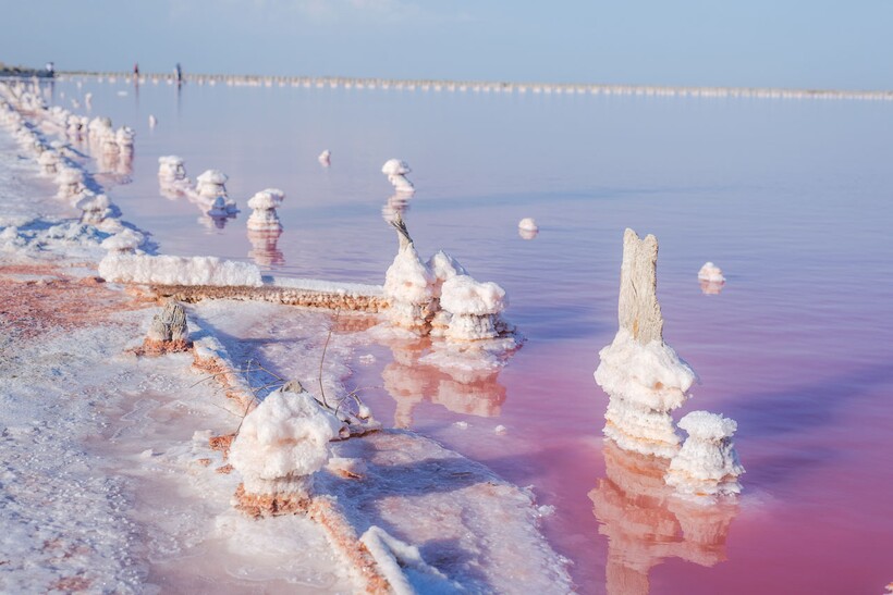 Наиболее удачное время для посещения этого места — с конца июля по конец сентября. Именно в этот период вода приобретает удивительно яркий оттенок, который варьируется от нежно-розового до бордового. Причина этого природного явления — микроскопические организмы археи и водоросль дуналиелла. Лучше всего необычный цвет воды виден в солнечную погоду в полдень или на закате.