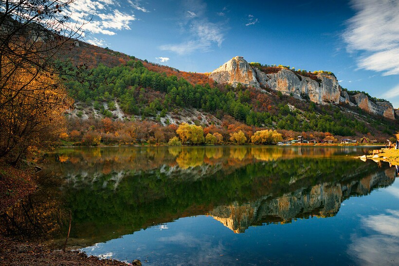 Озеро Мангупское (Девичье) с зеленого цвета водой расположено у подножия плато Мангуп. После похода можно пообедать в кафе на берегу. Здесь есть база отдыха с прокатом лодок, катамаранов и рыболовных снастей.