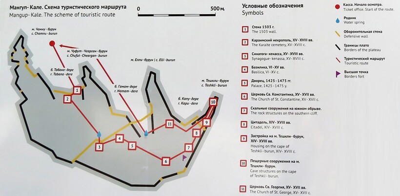 На маршруте стоит обратить внимание на руины базилики, квадраты раскопок дворца князей Феодоро, на остатки крепостных стен Мангуп-Кале, фундамент древнехристианской церкви Святых Константина и Елены и два крупных родника.
