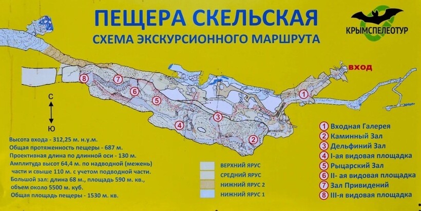 ЭТО ИНТЕРЕСНО! Ходы и лабиринты верхнего горизонта Скельской карстовой полости в Крыму идут не вниз, а по горизонтальной плоскости. Поэтому вход и дальняя видовая площадка находятся на одном уровне. Это удобно для туристов, так как в гротах нет сложных спусков и изнурительного подъема на обратном пути.