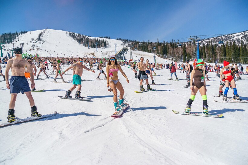 Шерегеш — горнолыжный кластер в Кемеровской области (Кузбасс) с максимальной высотой 1570 м. Снег в Шерегеше, обычно мягкий и пушистый благодаря географической удаленности региона от моря, в апреле становится липким и тяжелым, местами появляются проталины, для катания могут быть доступны не все трассы. Проверяйте их состояние через онлайн-камеры. С 8 по 23 апреля в Шерегеше устраивают фестиваль костюмированных спусков в купальниках Grelkafest.
