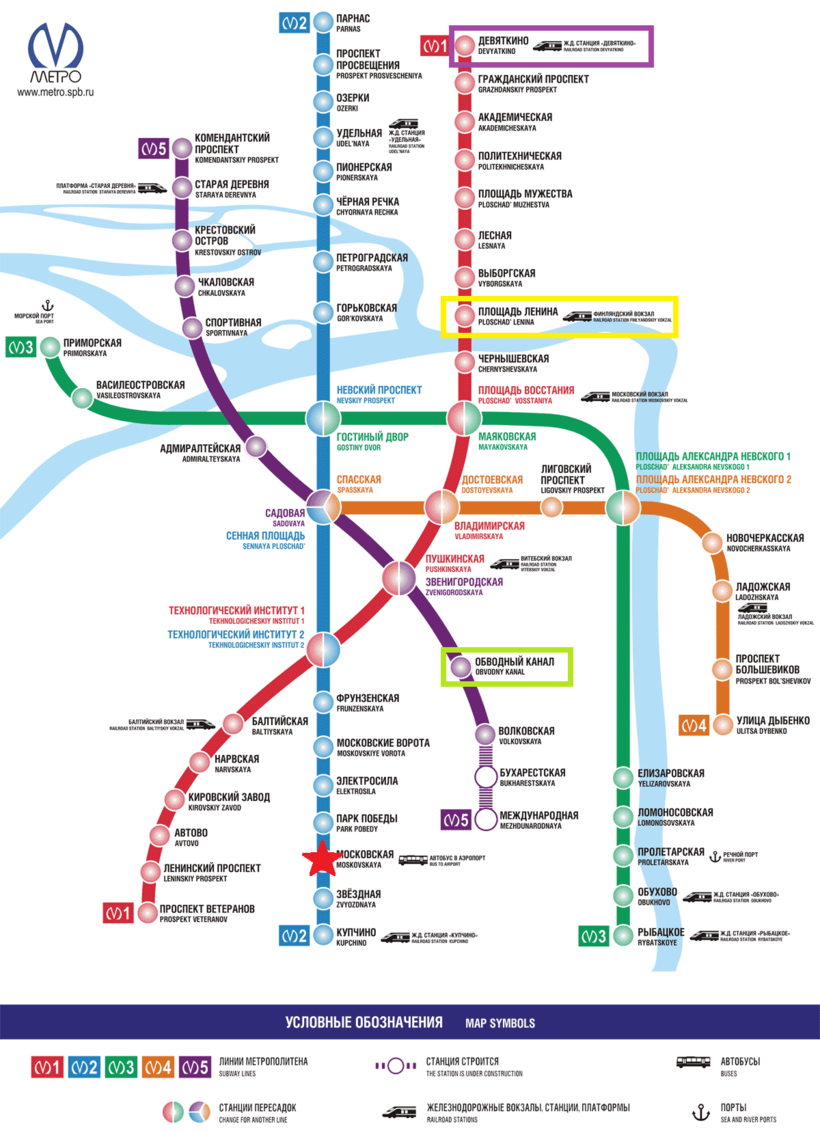 - автобус + метро. От здания аэропорта регулярно курсируют автобусы (№ 39, № 39А) и маршрутки (№ 39К) до станции метро «Московская». Время в пути 15 – 30 минут в зависимости от дорожной ситуации, стоимость проезда составляет 40 рублей. Для того, чтобы попасть на железнодорожный вокзал вам необходимо доехать до станции метро «Площадь Ленина» (пересадка на ст. «Технологический институт»), автовокзал находится в пределах 5-ти минут пешком от станции метро «Обводный канал» (пересадка на ст. «Сенная площадь»), Северный автовокзал – около станции метро «Девяткино» (пересадка на ст. «Технологический институт»). Помещаю для вашего удобства карту питерского метрополитена. На ней есть отметка начала маршрута – ст. м. Московская (красная звезда), отметки конечных остановок: Финляндский вокзал – жёлтый прямоугольник, автовокзал – салатовый, Северный автовокзал – фиолетовый.