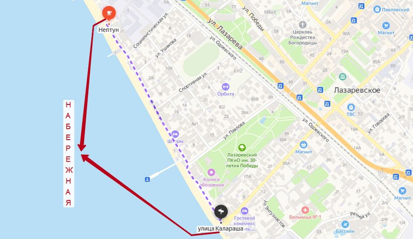 От улицы Лазарева дойти до центрального приморского променада можно по улицам Социалистическая, Ушакова, Спортивная, Павлова и Калараша.