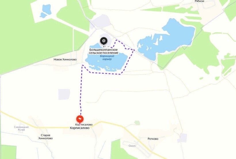 Затопленные карьерные котлованы находятся на севере от Санкт-Петербурга, за Гатчиной. Ближайшими к озеру населенными пунктами будут деревни Корписалово, Старое и Новое Хинколово.