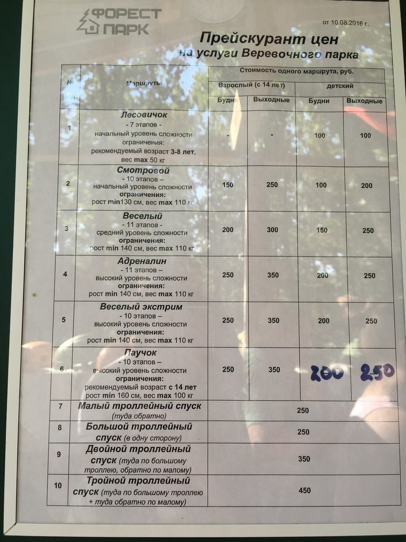 - «Адреналин», «Веселый экстрим» и «Паучок» — в будни 250 рублей, в выходные 350 рублей.