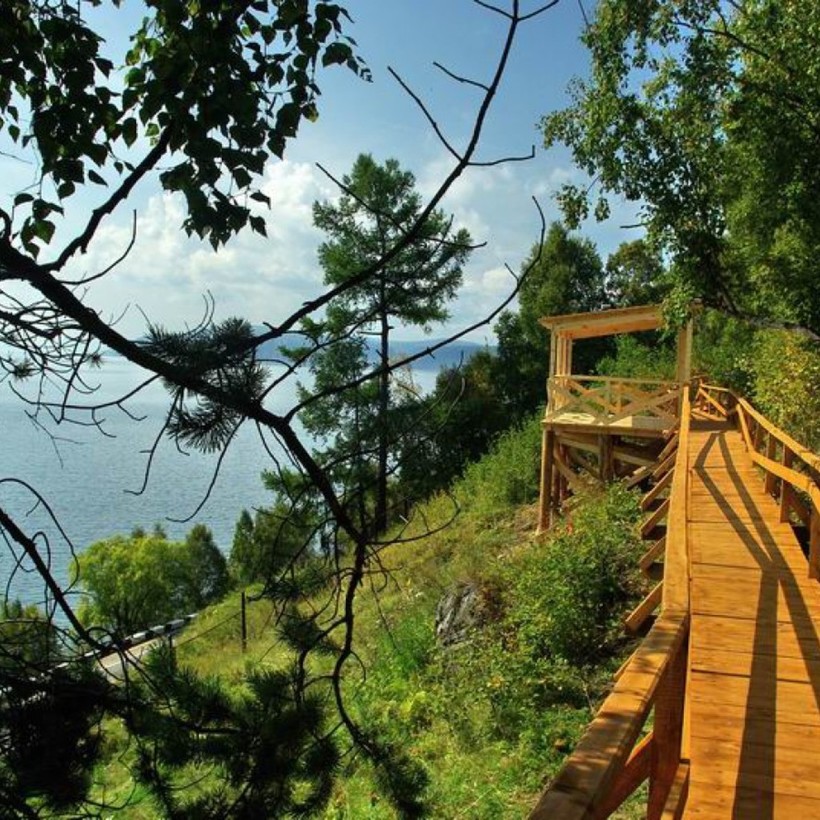 - Вид с вершины горы-камня Черского. Зимой вы можете отдохнуть в небольшом горнолыжном комплексе, что расположился на одной из горных вершин. Чтобы подняться на гору, можно воспользоваться пешим маршрутом, который серпантином вьется через красивый сосновый лес, где каждое дерево увешано разноцветными лентами (традиция местного населения и туристов — привязать яркую ленточку к ветке). Маршрут этот занимает около 40–60 минут спокойным шагом. А на самом верху открывается вид на озеро, я много где побывала, но этот вид всегда заставляет меня остановиться и провести на вершине горы не менее получаса в молчаливом созерцании. Также на вершину можно подняться по небольшой канатной дороге, которая в зимнее время служит подъемником для горнолыжников и сноубордистов.