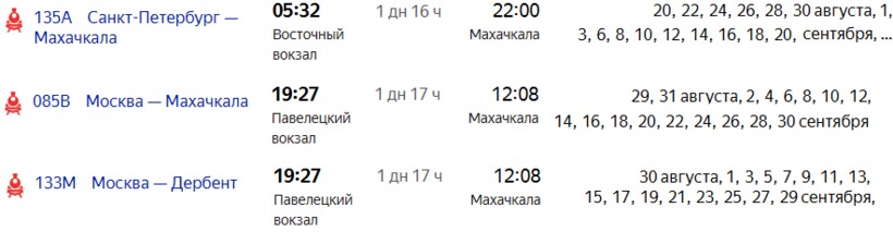 ПОЛЕЗНО. На TravelAsk можно купить по маршруту Москва — Махачкала ж/д билеты (и расписание поездов доступно на сайте).